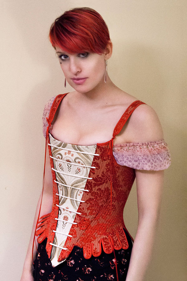 This Bodice was the first fully boned corset I ever made, I had to cut and tip tiny 4mm bones, some of which were only about an inch long! They looked so cute 😀 It has a front panel that sits behind the laces that’s completely detached. It’s great because you can flip it around for a completely different look.
